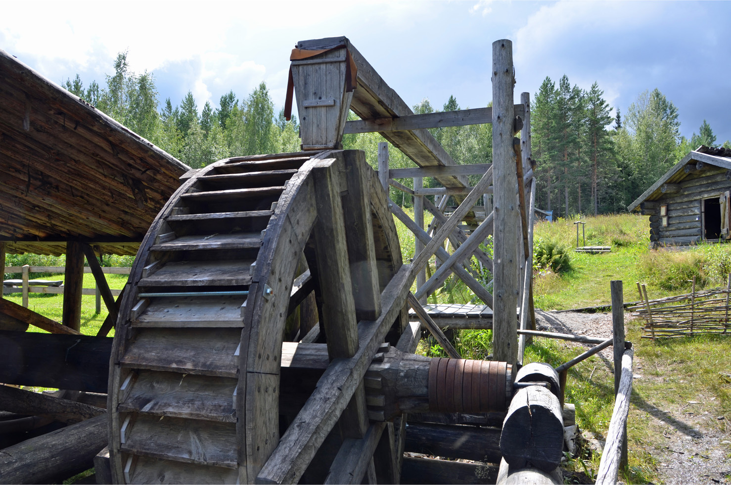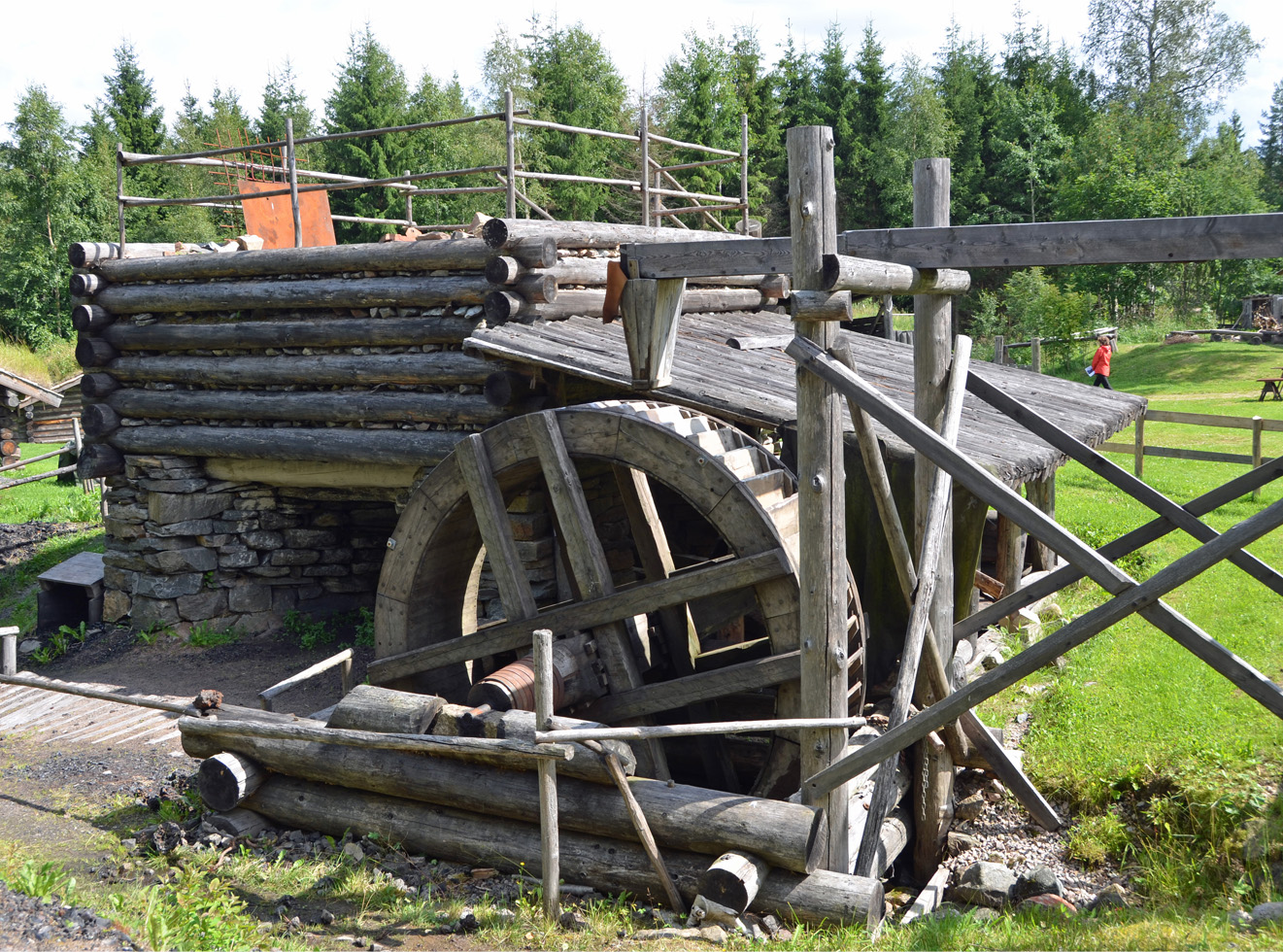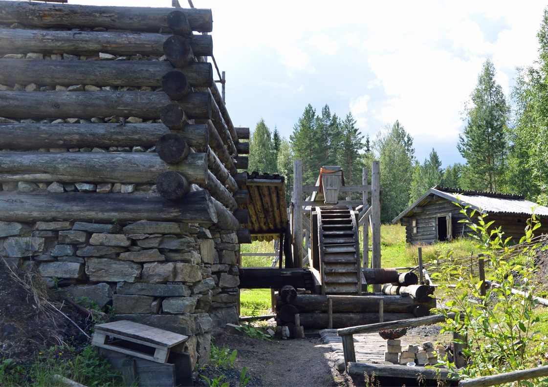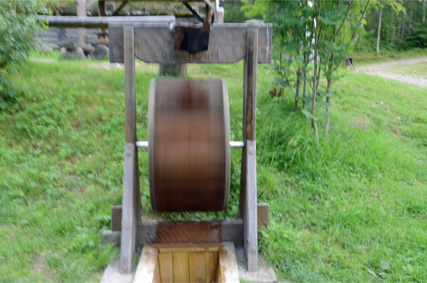 bälgar som pumpar luft in i masugnen med kraft från vattenhjulet